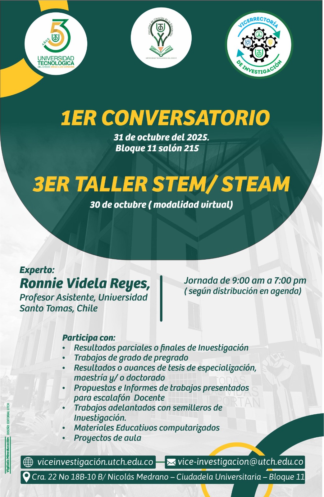 La Facultad de Ciencias de la Educación, en articulación con la Vicerrectoría de Investigación de la Universidad Tecnológica del Chocó “Diego Luis Córdoba”, extiende una cordial invitación a toda la comunidad académica para participar en el 1er Conversatorio y 3er Taller STEM/STEAM, espacios dedicados al intercambio de saberes, experiencias pedagógicas e iniciativas investigativas en torno a la educación científica y tecnológica.