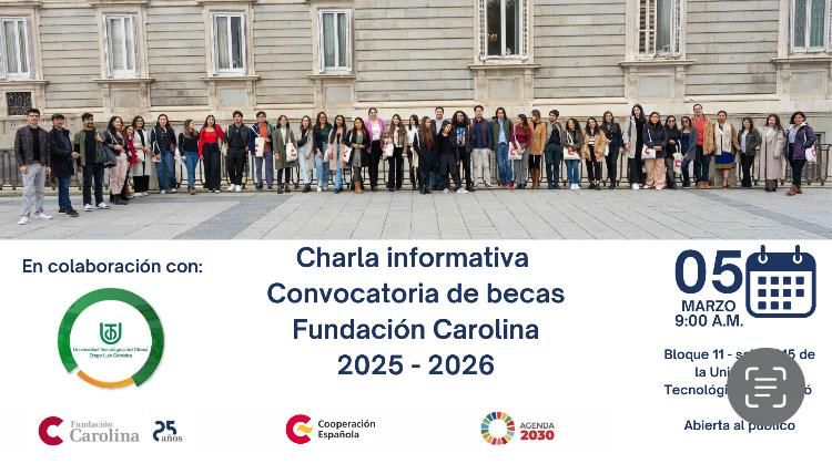 🌍 #Internacionalización – La Fundación Carolina, en colaboración con la Universidad Tecnológica de Chocó “Diego Luis Córdoba”, invita a toda la comunidad universitaria y al público en general a participar en una charla informativa sobre las becas disponibles para el año 2025.Durante esta sesión, se proporcionarán detalles clave sobre las becas de doctorado y las estancias cortas posdoctorales de investigación ofrecidas por la Fundación Carolina. Estas becas cubren gastos como matrícula, alojamiento y transporte, lo que representa una oportunidad única para que los profesionales amplíen sus horizontes académicos y accedan a una formación de alto nivel en universidades e instituciones prestigiosas de España.Además de ofrecer acceso a una educación internacional de calidad, estas becas promueven la movilidad académica y fomentan la cooperación con otras regiones de Europa y América Latina.Este evento brindará la oportunidad de conocer los requisitos, el proceso de postulación y las diversas oportunidades de desarrollo profesional que ofrecen estas becas.📅 Fecha: 5 de marzo de 2025