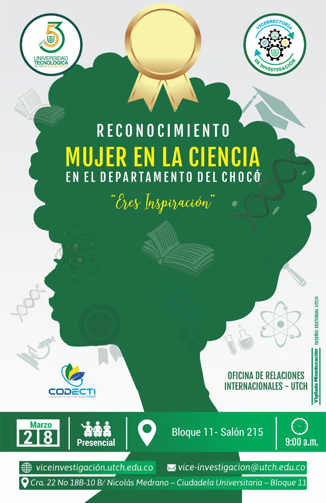 El propósito de "Eres Inspiración" es destacar el impacto significativo que las mujeres han tenido en el campo de la ciencia en nuestra región. A través de este reconocimiento, se busca honrar a aquellas que han abierto caminos en diversas disciplinas científicas e inspirar a futuras generaciones de mujeres a seguir sus pasos. La participación activa de las mujeres en la ciencia es esencial para el desarrollo y progreso de nuestra sociedad, y este acto se enmarca en la necesidad de visibilizar sus logros y contribuciones.Durante el evento, se llevarán a cabo diversas actividades diseñadas para promover la ciencia y la tecnología en el Chocó.Se homenajeará a entre 40 y 50 mujeres talentosas que se han destacado en sus respectivas áreas. Estas homenajeadas compartirán sus experiencias y trayectorias profesionales.Esta actividad se realizará el día vienes 28 de marzo, en las instalaciones del Alma Mater, bloque 11 salón 215, a las 9 de la mañana.
