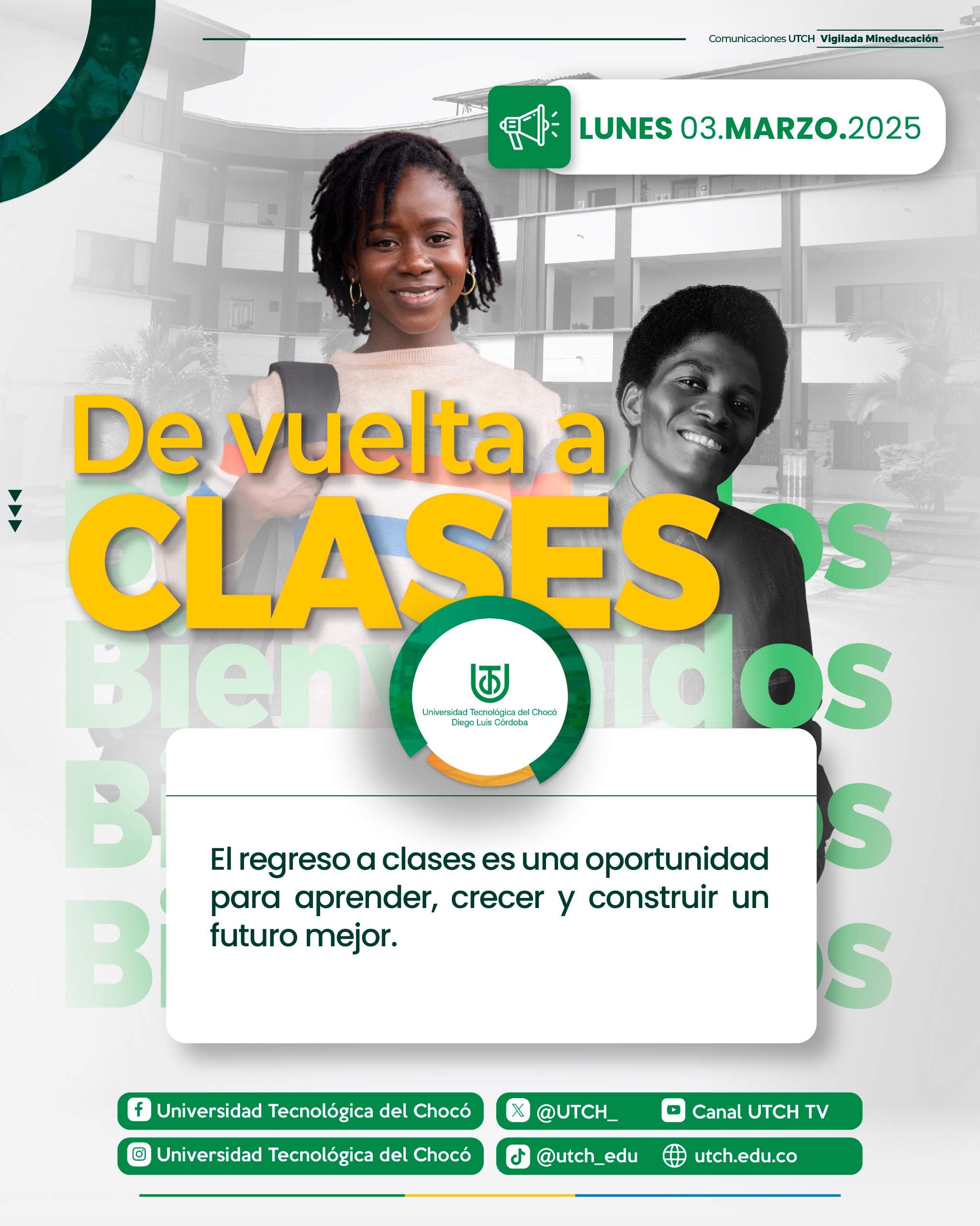 El rector Alfredo ha dado una excelente noticia para la comunidad estudiantil: el próximo 3 de marzo comenzará un nuevo ciclo académico en nuestra Universidad Tecnológica del Chocó. Con esta fecha marcada en el calendario, invitamos a todos los estudiantes a que se preparen para un regreso lleno de oportunidades, crecimiento y aprendizaje.El rector ha resaltado que todo el plantel físico y humano de la universidad está dispuesto a brindarles las mejores condiciones para su formación. Desde el personal administrativo hasta los docentes, todos estamos comprometidos con ofrecerles un ambiente académico acogedor, de calidad y en donde cada estudiante pueda ejercer plenamente su derecho a la educación."Los esperamos con los brazos abiertos", expresó el rector Alfredo, "para que juntos sigamos construyendo un futuro lleno de conocimiento, innovación y desarrollo para nuestra región."Así que, estudiantes, ¡prepárense para iniciar este nuevo ciclo con energía y entusiasmo! La Universidad Tecnológica del Chocó les da la bienvenida para este gran inicio de clases.