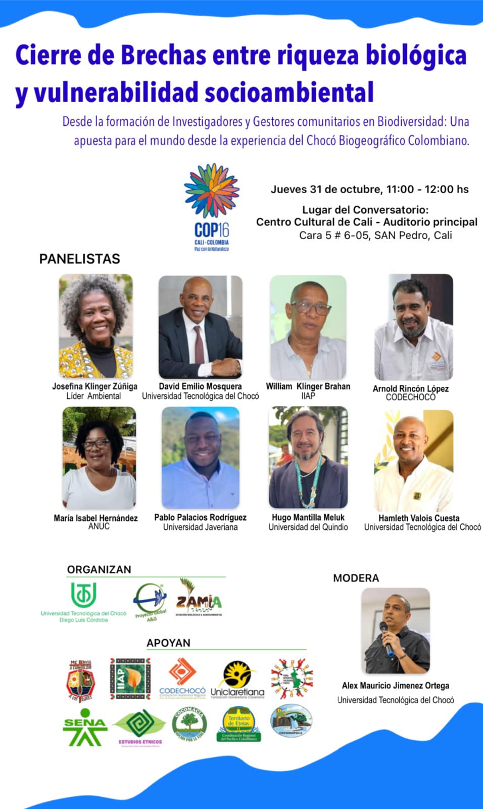 🌿🌍 Este jueves 31 de octubre se llevará a cabo un importante evento en Cali, Valle del Cauca, titulado “Cierre de Brechas entre Riqueza Biológica y Vulnerabilidad Socioambiental”. Este panel se enmarca en un esfuerzo por destacar y fortalecer la formación de investigadores y gestores comunitarios en biodiversidad, con una perspectiva única desde la experiencia del Chocó Biogeográfico Colombiano.