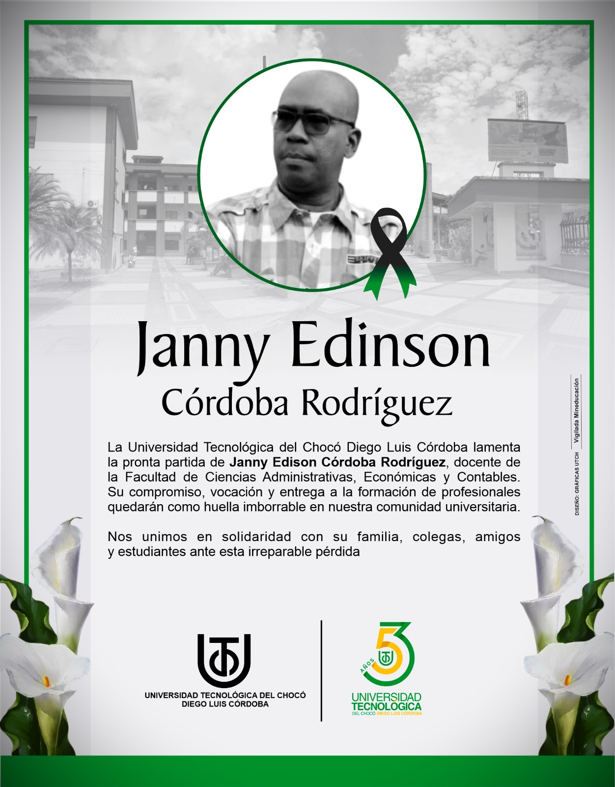 La comunidad universitaria de la Universidad Tecnológica del Chocó Diego Luis Córdoba lamenta profundamente el fallecimiento del docente Janny Edison Córdoba Rodríguez, perteneciente a la Facultad de Ciencias Administrativas, Económicas y Contables.