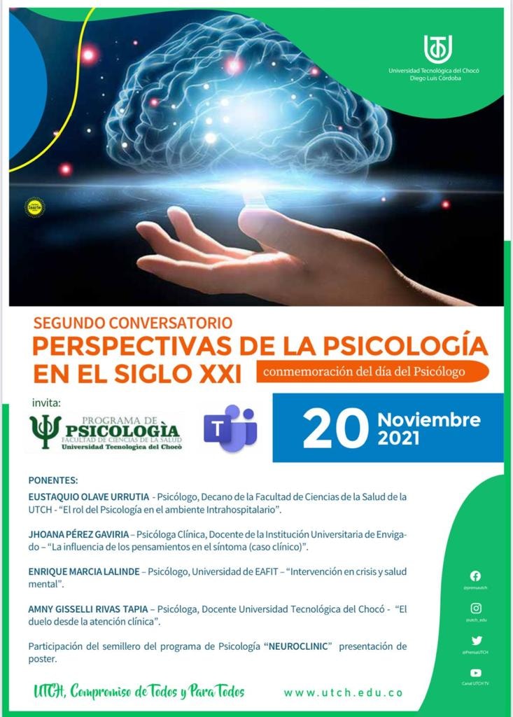 La Facultad de Ciencias de la Salud, programa de Psicología, invitan al segundo conversatorio sobre las PERSPECTIVAS DE LA PSICOLOGÍA EN EL SIGLO XXI, conmemoración del día del Psicólogo.