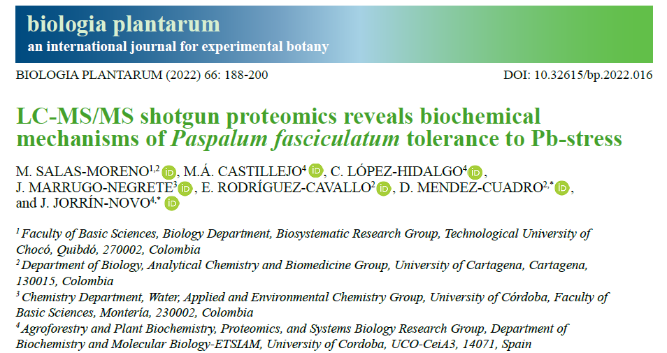 En este estudio se determinaron los mecanismos bioquímicos de tolerancia a metales pesados, específicamente de plomo, de una especie de pasto (Paspalum fasciculatum), la cual tiene capacidad de fitorremediar metales pesados como el Cd, Pb y Hg en suelos degradados por la minería de oro. Para dilucidar los mecanismos bioquímicos de tolerancia al estrés por Pb en estas plantas, se utilizó técnicas PROTEÓMICAS (Shotgun Proteomics), basada en cromatografía liquida con espectrometría de masas en tándem (LC-MS/MS). De esta forma se identificaron 323 proteínas involucradas en la fotosíntesis y metabolismo de sacáridos y energía, proteínas de defensa antioxidante, mejorando la protección y reparación de otras proteínas y proteínas de señales de transducción para coordinar la respuesta fisiológica al estrés por Pb. Nuestros resultados a nivel mundial proporcionan información importante para comprender los mecanismos de tolerancia en P. fasciculatum y podría ser importante en futuros estudios moleculares sobre la resistencia y acumulación de Pb en otras plantas. Pero sin duda para Colombia y específicamente el Chocó es una investigación muy importante, debido a la aplicabilidad de esta planta para fitorremediar grandes extensiones de suelo degradados y contaminados con metales pesados producto de la minería de oro.
