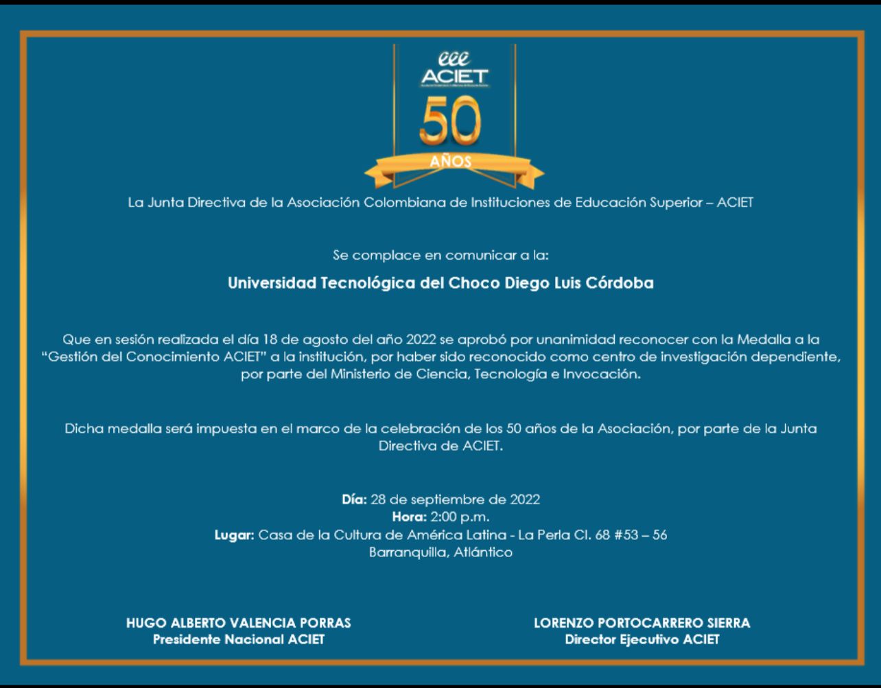 La Junta Directiva de la Asociación Colombiana de Instituciones de Educación Superior -ACIET, otorgó reconocimiento a la Universidad Tecnológica del Chocó Diego Luis Córdoba, por el trabajo riguroso, innovador, comprometido y disciplinado de los integrantes de su comunidad educativa, en especial de los docentes investigadores, aportando a la construcción de escenarios de aprendizaje, fortalecimiento investigativo institucional y al progreso de la sociedad; posibilitando la alta calidad de la educación superior del pais.