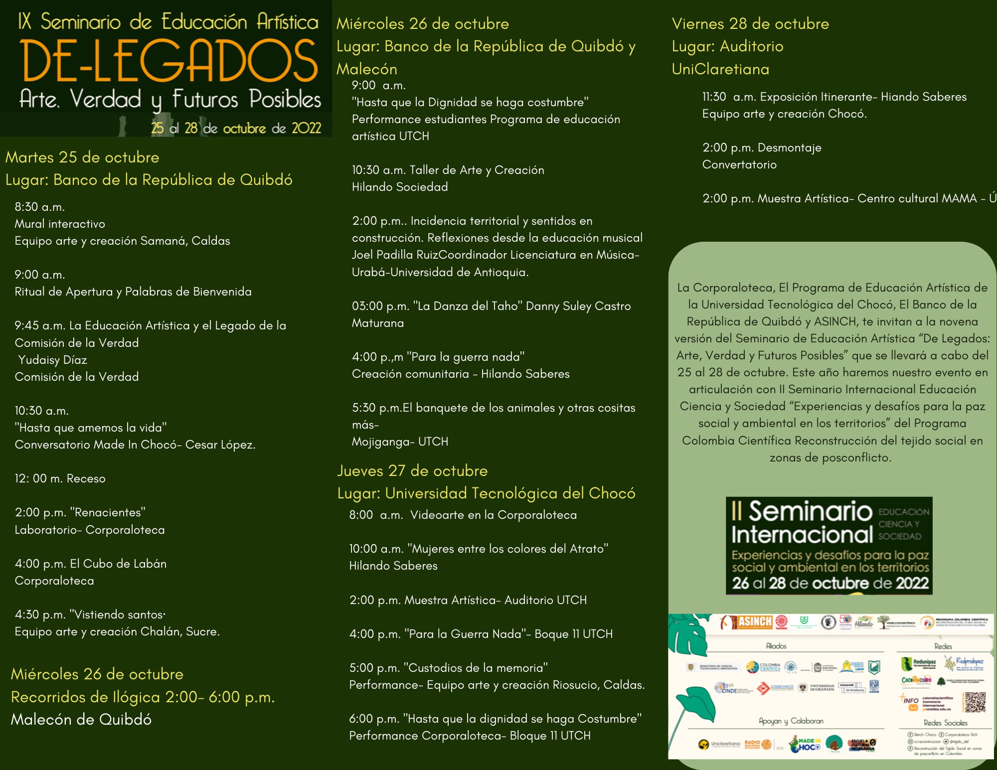 El IX Seminario de Educación Artística: “De Legados: Arte, Verdad y Futuros posibles” se lleva a cabo del 24 al 27 de octubre de 2022 en las instalaciones del Banco de la República de Quibdó y la Universidad Tecnológica del Chocó”Diego Luis Córdoba".
