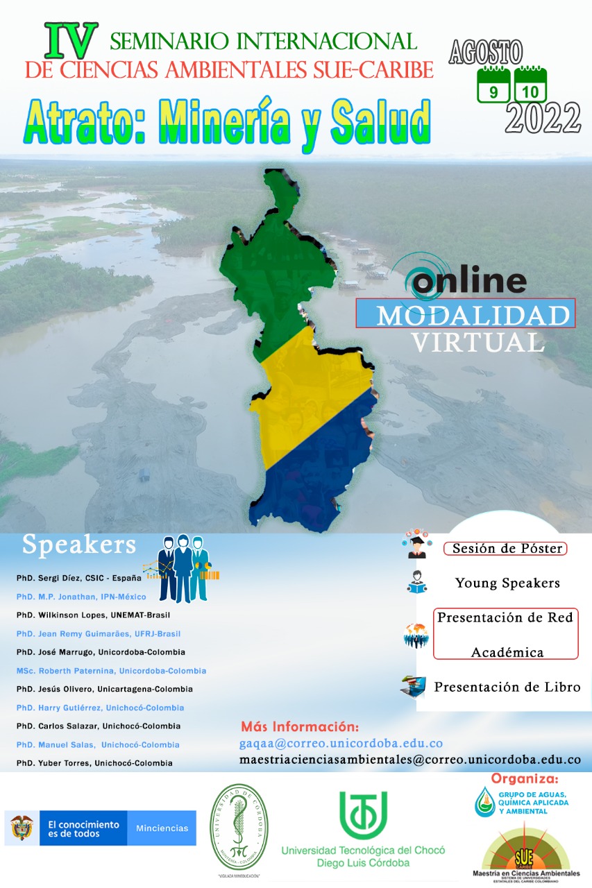 El IV Seminario Internacional de Ciencias Ambientales SUE-Caribe “Atrato, Minería y Salud” es un evento académico de carácter internacional. Este se realiza con el fin de promover la difusión de resultados de proyectos de investigación de Ciencia Tecnología e Innovación en el campo de las Ciencias Ambientales, y contribuye a la interacción entre diferentes personas que realizan actividades de Ciencia Tecnología e Innovación que provienen de diferentes lugares pero que tienen intereses en temas académicos propuestos dentro evento.