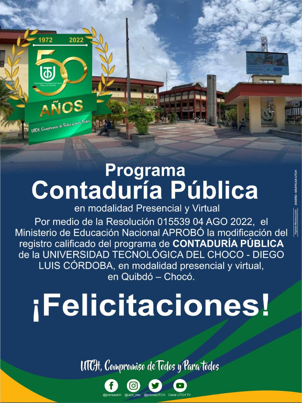 Por medio de la Resolución 015539 04 AGO 2022, APROBÓ la modificación del registro calificado del programa de CONTADURÍA PÚBLICA de la UNIVERSIDAD TECNOLÓGICA DEL CHOCO - DIEGO LUIS CÓRDOBA, en modalidad presencial y virtual, en Quibdó – Chocó.