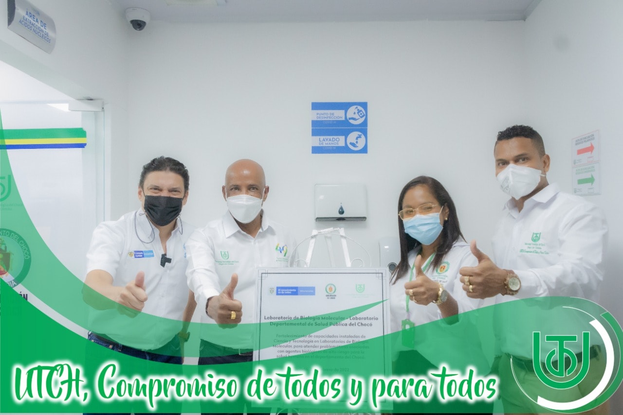 Este acto contó con la presencia del Dr. José Crissien Borrero, Ministro de Ciencias, Tecnología e Innovación, el Dr. David Emilio Mosquera Valencia, Rector de la UTCH, Alexander Córdoba Arias, Director del Proyecto Laboratorios de Biología Molecular, el Consejo Superior de la UTCH y la comunidad Académica.