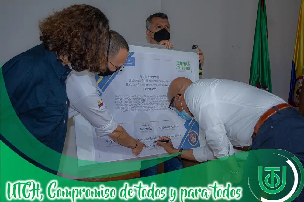 Acompañados por más de 150 jovenes líderes de colegios del Chocó, el Rector David Emilio Mosquera Valencia, Nancy Patricia Gutierrez , Consejera Presidencial para los Derechos Humanos y Asuntos Internacionales, Ariel Palacios Calderón, Gobernador del Chocó, firmaron el proyecto Zona Futuro y se conformó la mesa Departamental de Prevención de Reclutamiento de Niñas, Niños y Adolescentes del Chocó, que beneficiará a más de 2.000 jóvenes en el Chocó.