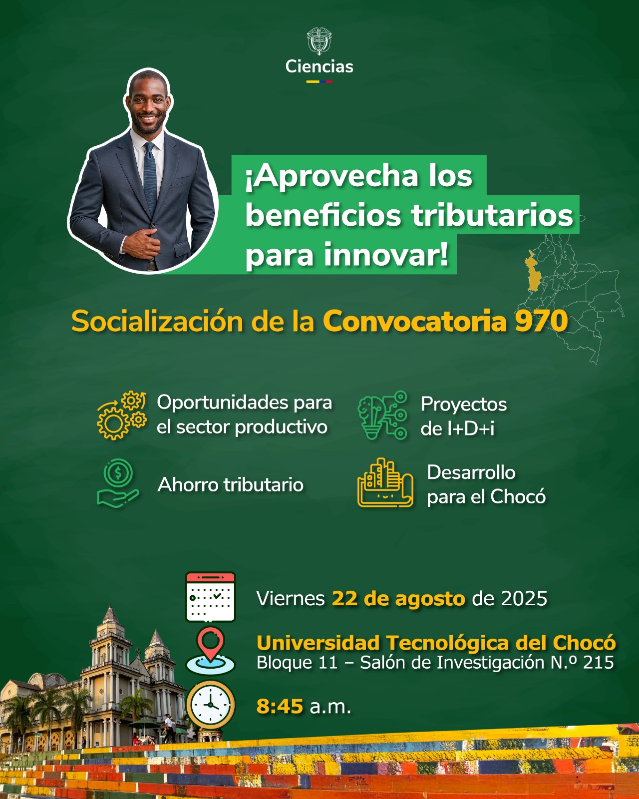 La Universidad Tecnológica del Chocó Diego Luis Córdoba, en colaboración con la Vicerrectoría de Investigación y el Ministerio de Ciencia, Tecnología e Innovación (MinCiencias), invita a docentes, investigadores, líderes de grupos de investigación, empresarios y público en general a participar en la socialización de la Convocatoria 970.