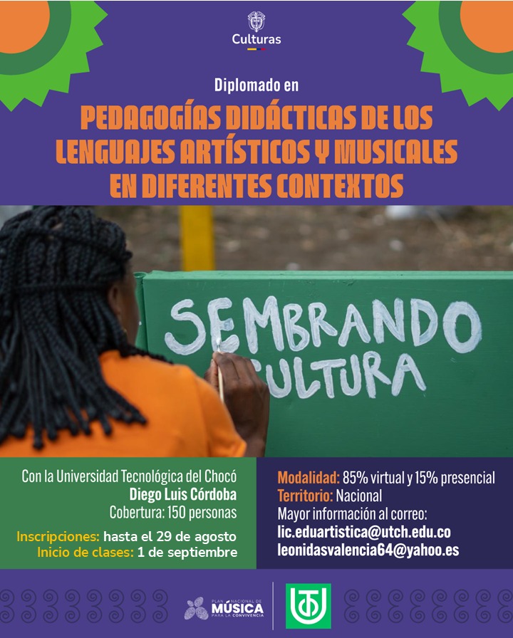 La Universidad Tecnológica del Chocó Diego Luis Córdoba en alianza con el Ministerio de las Culturas, las Artes y los Saberes, a través de la Dirección de Artes,están invitando a participar en el Diplomado en Pedagogías Didácticas de los Lenguajes Artísticos y Musicales en Diferentes Contextos "Sembrando Cultura".