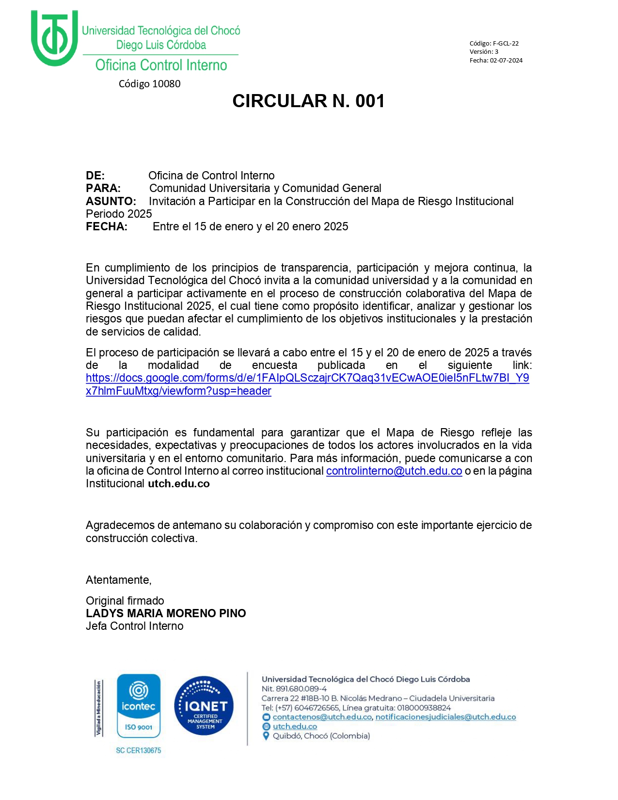 En cumplimiento de los principios de transparencia, participación y mejora continua, la Universidad Tecnológica del Chocó invita a la comunidad universidad y a la comunidad en general a participar activamente en el proceso de construcción colaborativa del Mapa de Riesgo Institucional 2025, el cual tiene como propósito identificar, analizar y gestionar los riesgos que puedan afectar el cumplimiento de los objetivos institucionales y la prestación de servicios de calidad.