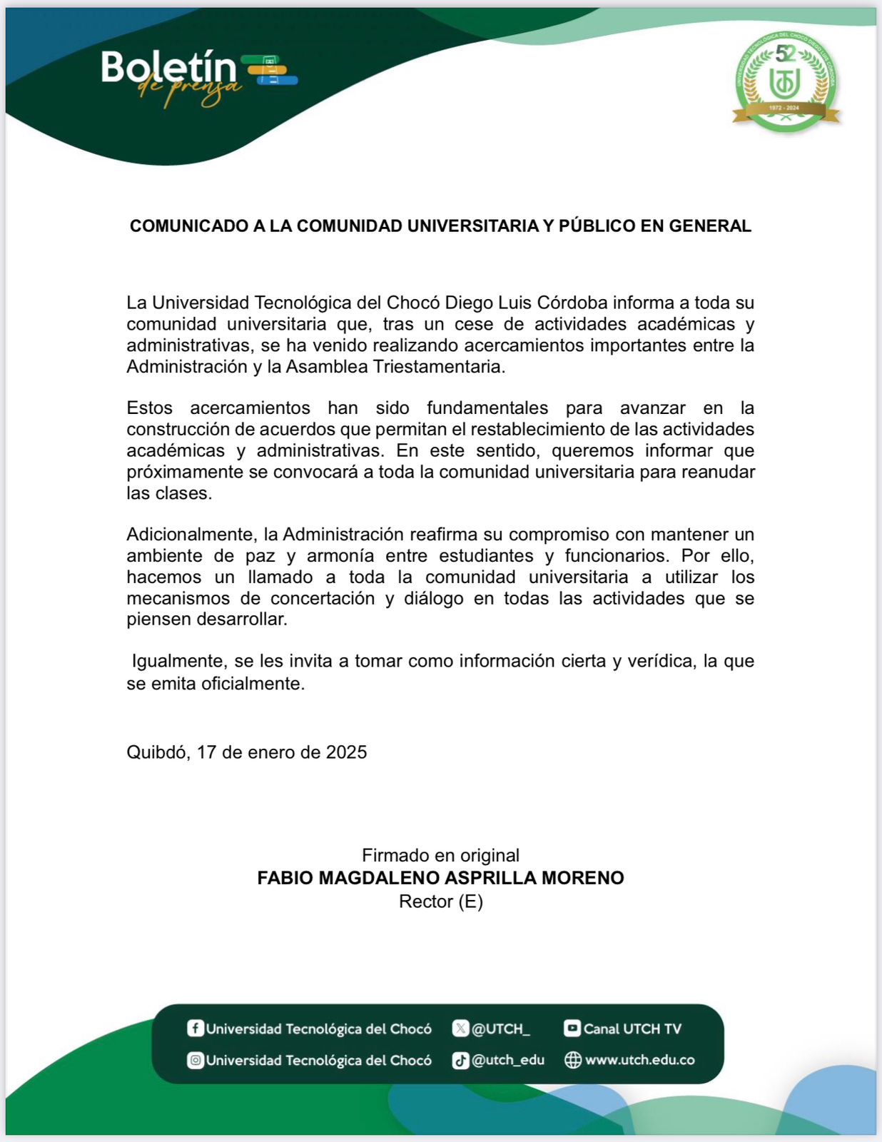 La Universidad Tecnológica del Chocó Diego Luis Córdoba informa a toda su comunidad universitaria que, tras un cese de actividades académicas y administrativas, se ha venido realizando acercamientos importantes entre la Administración y la Asamblea Triestamentaria.