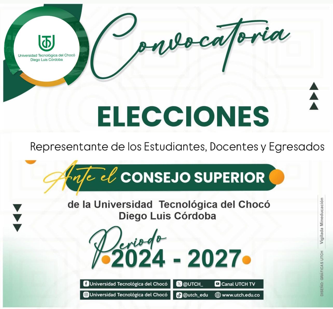 De conformidad con lo establecido en el Consejo Superior de la Universidad Tecnológica del Chocó, se informa a la comunidad universitaria y en general que, mediante el Acuerdo N. 0029 , Acuerdo N. 0030 y el Acuerdo N. 0031 del 13 de noviembre del 2024 , se autoriza, reglamenta y convoca las Elecciones de Representante de los Estudiantes, Egresados y Docentes ante el Consejo Superior de la Universidad Tecnológica del Chocó, periodo 2024-2027.Los candidatos que pretendan ser elegidos representantes de los Estudiantes, Docentes o Egresados deberán inscribirse en las fechas y horas indicadas en el cronograma adoptado por el Consejo Superior Universitario.Igualmente, la inscripción se realizará de forma presencial frente a dos testigos en la Secretaría General de la institución, quien dará traslado al Comité Electoral, dentro de los plazos estipulados para tal fin, para lo de su competencia.🗳 Estudiantes, Acuerdo N. 0029 del 13 de noviembre de 2024 : https://utch.edu.co/nueva/images/2024/acuerdo3/ACUERDO_0029_-_13_NOVIEMBRE_CONVOCATORIA_ELECCIONES_ESTUDIANTES.pdf🗳 Egresados, Acuerdo N. 0030 del 13 de noviembre de 2024 : https://utch.edu.co/nueva/images/2024/acuerdo3/ACUERDO_0030_-_13_NOVIEMBRE_CONVOCATORIA_ELECCIONES_EGRESADOS.pdf🗳 Docentes, Acuerdo N. 0031 del 13 de noviembre de 2024 : https://utch.edu.co/nueva/images/2024/acuerdo3/ACUERDO_0031_-_13_NOVIEMBRE_CONVOCATORIA_ELECCIONES_DOCENTES.pdf