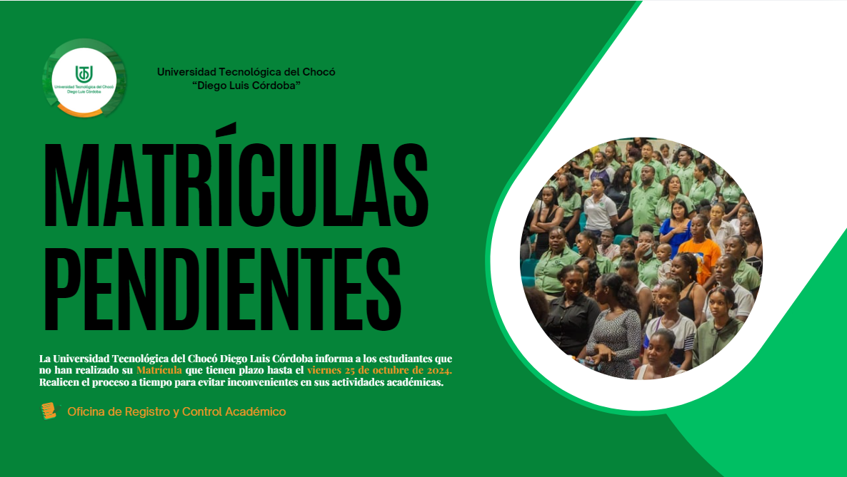 La Universidad Tecnológica del Chocó Diego Luis Córdoba informa a todos los estudiantes que aún no han completado el proceso de matrícula que el plazo para realizarlo finaliza el próximo viernes 25 de octubre de 2024.