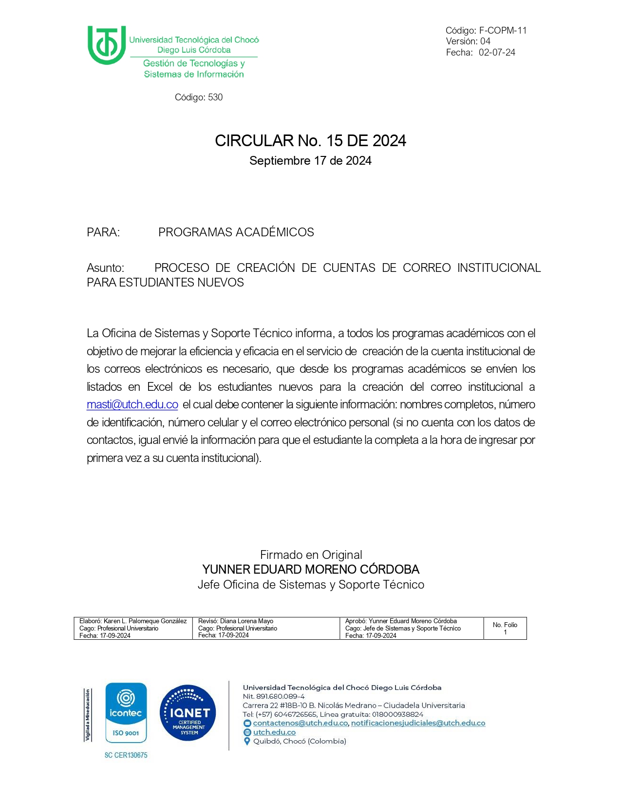 Asunto: PROCESO DE CREACIÓN DE CUENTAS DE CORREO INSTITUCIONAL PARA ESTUDIANTES NUEVOS