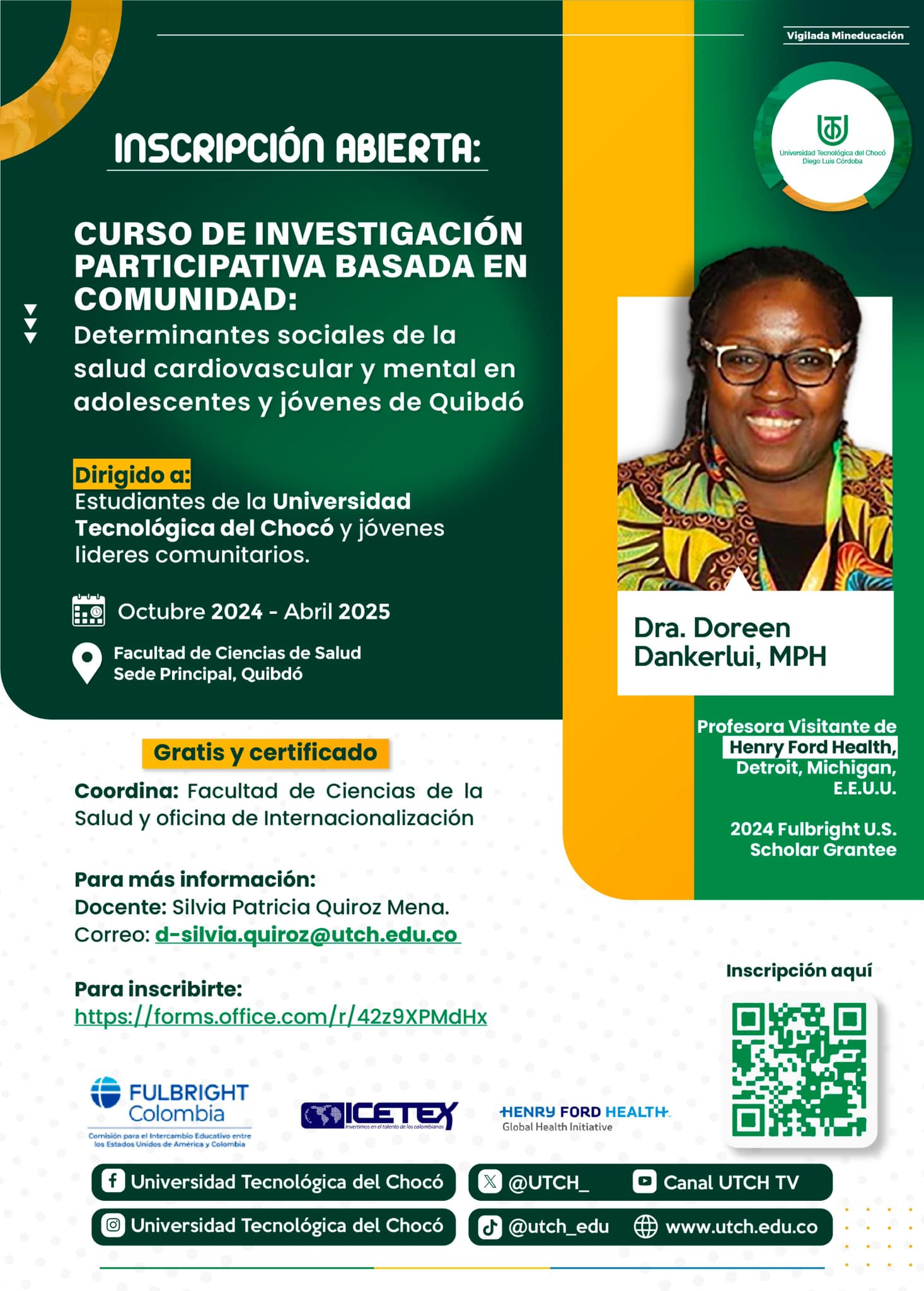 Dirigido a estudiantes de la Universidad Tecnológica del Chocó Diego Luis Córdoba y jóvenes líderes comunitarios, el curso se desarrollará desde octubre de 2024 hasta abril de 2025 en la Facultad de Ciencias de la Salud, en la sede principal de Quibdó. La capacitación será impartida por la Dra. Doreen Dankerlui, MPH, una reconocida profesora visitante de Henry Ford Health en Detroit, Michigan, y becaria Fulbright US Scholar 2024.