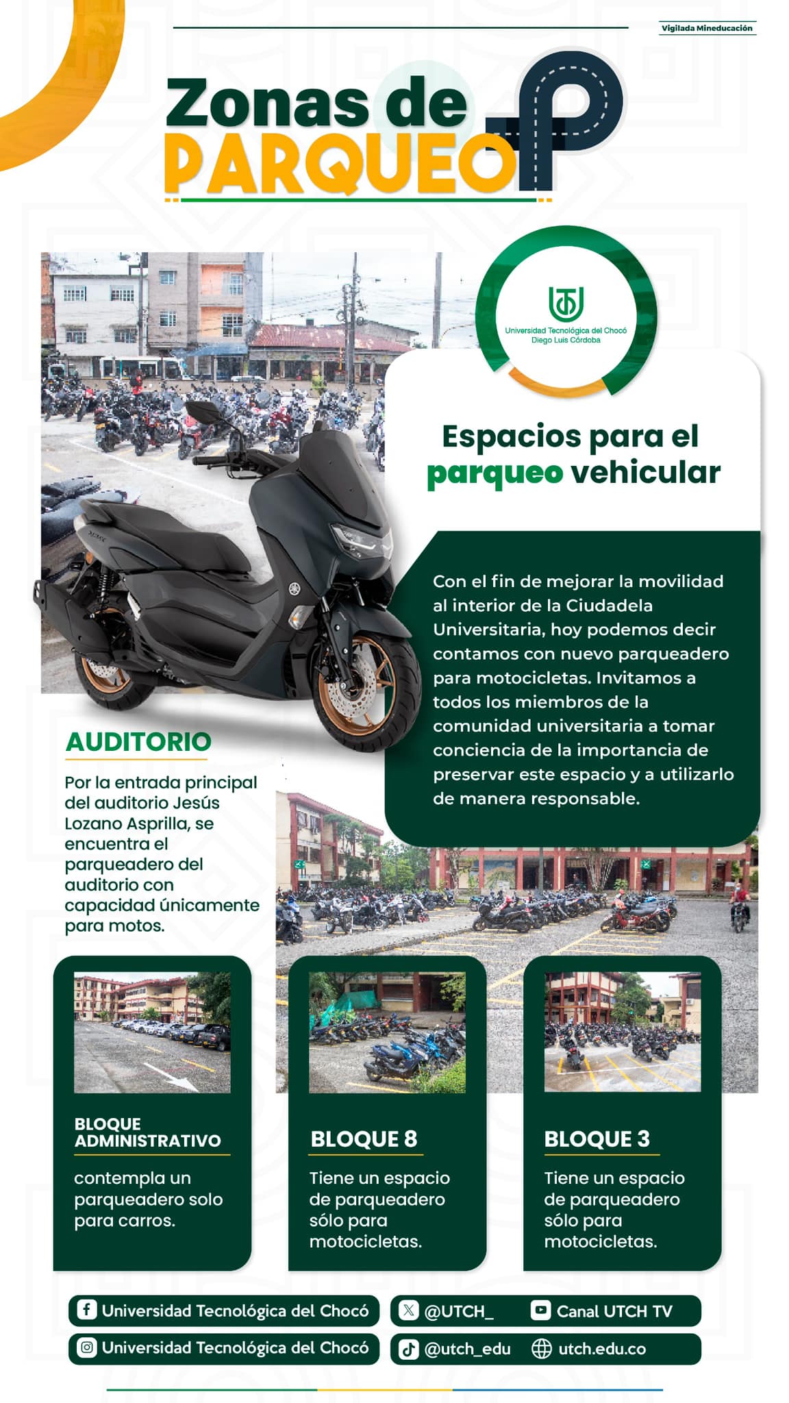 El parqueadero junto al Auditorio Jesús Lozano Asprilla está destinado exclusivamente a motocicletas, brindando una opción segura y accesible para aquellos que utilizan este medio de transporte. Además, hemos habilitado zonas de parqueo adicionales en los bloques Administrativo, 3 y 8, con espacios designados específicamente para carros y motocicletas, respetando las particularidades de cada zona.