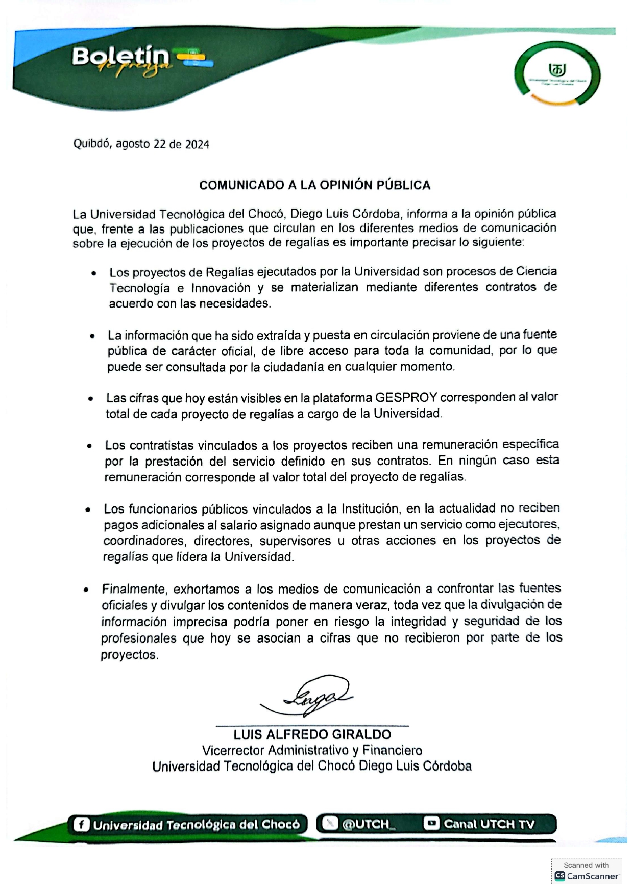 La universidad Tecnologica del chocó, Diego Luis Córdoba, informa a la opinión publica que, frente a las publicaciones que circulan en los diferentes medios de comunicación sobre la ejecución de los proyectos de regalias es importante precisar lo siguientes: