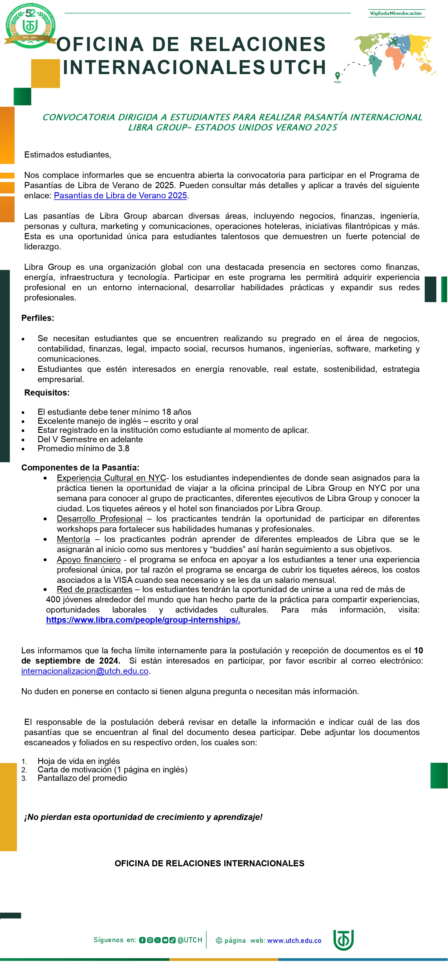 Componentes de la Pasantía: • Experiencia Cultural en NYC- los estudiantes independientes de donde sean asignados para la práctica tienen la oportunidad de viajar a la oficina principal de Libra Group en NYC por una semana para conocer al grupo de practicantes, diferentes ejecutivos de Libra Group y conocer la ciudad. Los tiquetes aéreos y el hotel son financiados por Libra Group. • Desarrollo Profesional – los practicantes tendrán la oportunidad de participar en diferentes workshops para fortalecer sus habilidades humanas y profesionales. • Mentoría – los practicantes podrán aprender de diferentes empleados de Libra que se le asignarán al inicio como sus mentores y “buddies” así harán seguimiento a sus objetivos. • Apoyo financiero - el programa se enfoca en apoyar a los estudiantes a tener una experiencia profesional única, por tal razón el programa se encarga de cubrir los tiquetes aéreos, los costos asociados a la VISA cuando sea necesario y se les da un salario mensual. • Red de practicantes – los estudiantes tendrán la oportunidad de unirse a una red de más de 400 jóvenes alrededor del mundo que han hecho parte de la práctica para compartir experiencias, oportunidades laborales y actividades culturales. Para más información, visita: https://www.libra.com/people/group-internships/. Les informamos que la fecha límite internamente para la postulación y recepción de documentos es el 10 de septiembre de 2024. Si están interesados en participar, por favor escribir al correo electrónico: Esta dirección de correo electrónico está siendo protegida contra los robots de spam. Necesita tener JavaScript habilitado para poder verlo.. No duden en ponerse en contacto si tienen alguna pregunta o necesitan más información. El responsable de la postulación deberá revisar en detalle la información e indicar cuál de las dos pasantías que se encuentran al final del documento desea participar. Debe adjuntar los documentos escaneados y foliados en su respectivo orden, los cuales son: 1. Hoja de vida en inglés 2. Carta de motivación (1 página en inglés) 3. Pantallazo del promedio