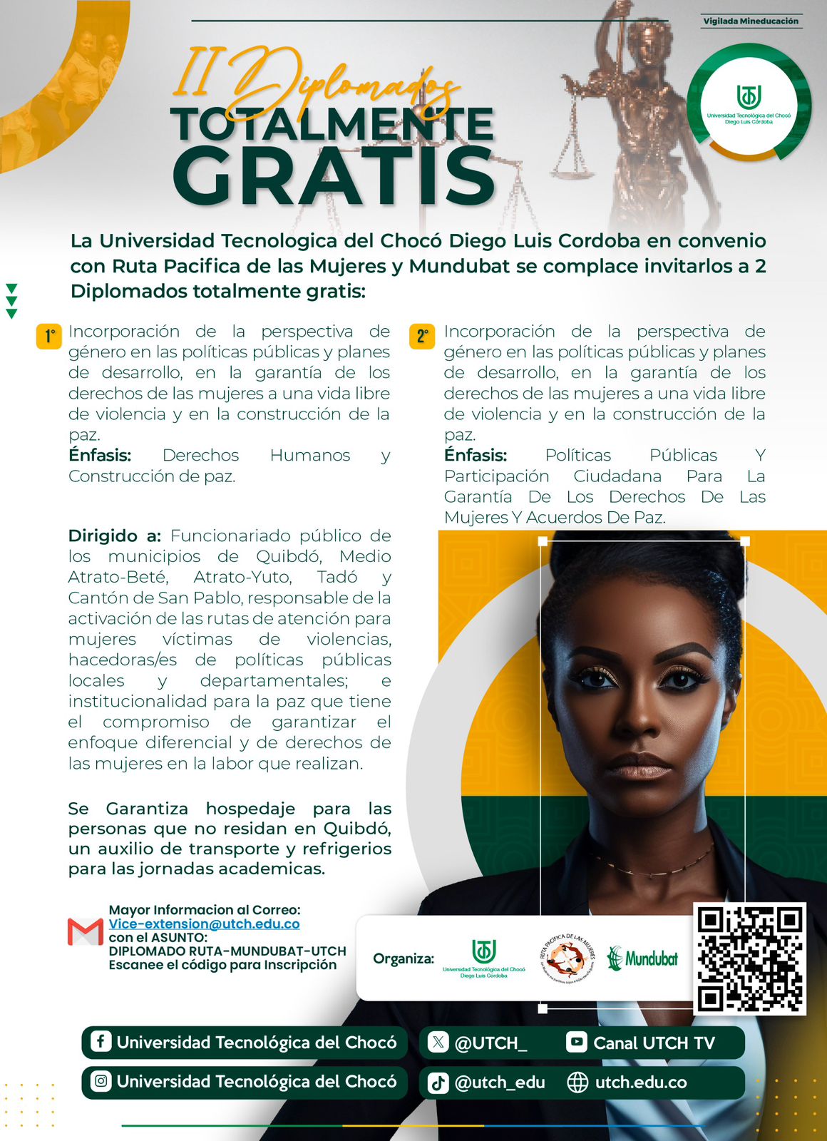 La Universidad Tecnológica del Chocó Diego Luis Córdoba, en alianza estratégica con la Ruta Pacífica de las Mujeres y con el apoyo del Gobierno Vasco a través de la Fundación Mundubat. Ofrecen 2 Diplomados Totalmente Gratis