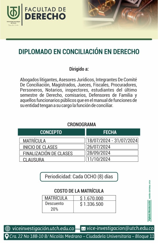 La Universidad Tecnológica del Chocó Diego Luis Córdoba abre las inscripciones para el Diplomado en Conciliación Extrajudicial en Derecho, el cual se convertirá en una herramienta fundamental para la construcción de un sistema judicial más eficiente y efectivo en el departamento.Los participantes podrán certificarse como conciliadores ante el Ministerio de Justicia, brindando una oportunidad única para la formación profesional de abogados, jueces, fiscales, procuradores, personeros, notarios, inspectores, estudiantes, funcionarios públicos y aquellos que, en el ejercicio de sus funciones, necesiten conciliar.El programa se desarrollará desde el 26 de julio hasta el 28 de septiembre del año en curso y tendrá un costo de 1’670.000. Para los estudiantes tendrá el 20% de descuento quedando en 1’336.500.Las personas interesadas en inscribirse pueden contactarnos a través del correo Esta dirección de correo electrónico está siendo protegida contra los robots de spam. Necesita tener JavaScript habilitado para poder verlo.¡Matrículas abiertas hasta el 31 de julio