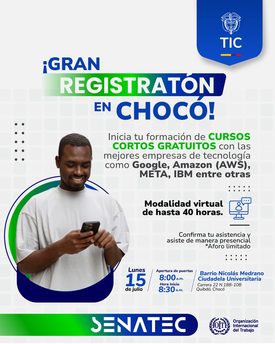 ¡Hola! Te invitamos al Gran Registro en Chocó, una oportunidad para iniciar tu formación en **cursos cortos y gratuitos, impartidos por las mejores empresas de tecnología como **Google, Amazon (AWS), META e IBM, entre otras.