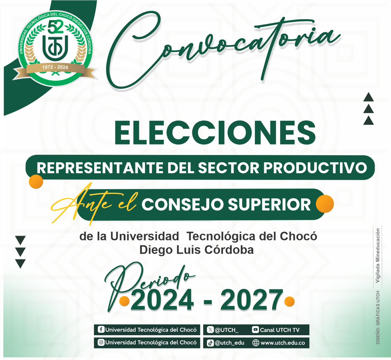 Se informa a la comunidad universitaria y en general que, mediante el acuerdo 0014 del 14 de junio del 2024 , se autoriza, reglamenta y convoca las Elecciones de Representante del Sector Productivo ante el Consejo Superior de la Universidad Tecnológica del Chocó, periodo 2024-2027.