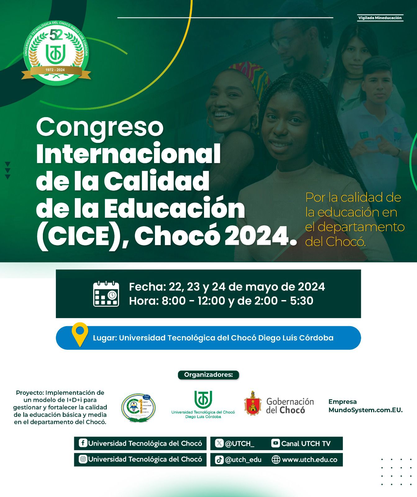 Congreso Internacional | Invitamos a los docentes, directivos docentes y personal administrativo de las instituciones básicas y medias del departamento del Chocó, a participar en el Congreso Internacional de la Calidad de la Educación.