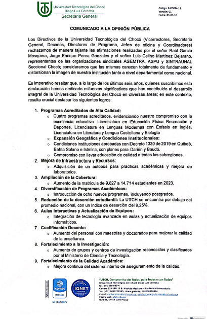 Los directivos de la Universidad Tecnológica del Chocó (Vicerrectoria, Secretaria General, Decanos, Directivos de Programas, Jefes de Oficina y Coordinadores) rechazamos de manera tajante las afirmaciones realizadas por el señor Raúl García Mosquera, Jorge Perea Gonzales y el señor Luis Cecino Mártínez Bejarano. . . , representante de las organizaciones sindicales ASEMTRA, ASPU y SINTRAUNAL seccional Chocó; Consideramos que las mismas carecen totalmente de fundamento y distorsionan la imagen de nuestra institución tanto a nivel departamental como nacional.