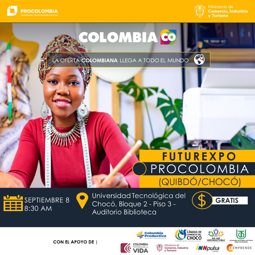 ProColombia, La Universidad Tecnológica del Chocó, la Cámara de Comercio del Chochó, CEmprende INNpulsa, Colombia Productiva y We are unforgettable, tienen el gusto de invitarle a participar de Futurexpo para la región Chocó.