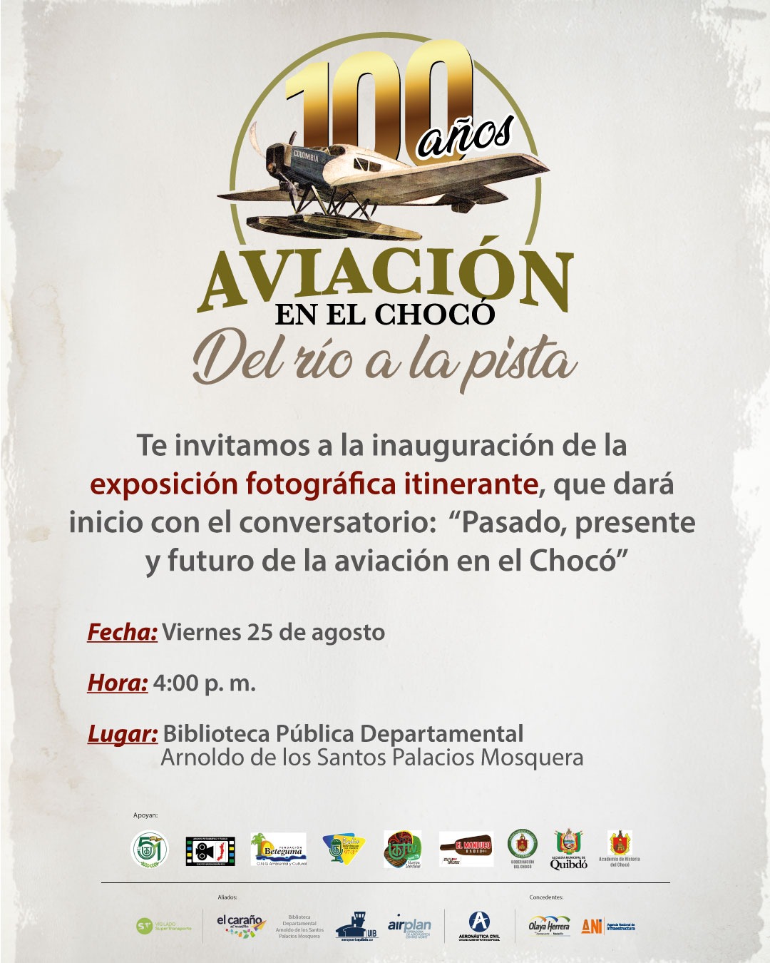 El 25 de agosto a las 4:00 de la tarde en el marco de la Conmemoración del primer siglo de la llegada de la aviación a nuestra región, se inaugurará en la Biblioteca Departamental Arnoldo de los Santos Palacios de Quibdó, la exposición fotográfica DEL RIO A LA PISTA: 100 años de la llegada de la aviación comercial al Chocó, organizada por el Archivo Fotográfico y Fílmico del Chocó de la Universidad Tecnológica del Chocó y que amablemente apoyó para su concreción la empresa Airplan Plan.