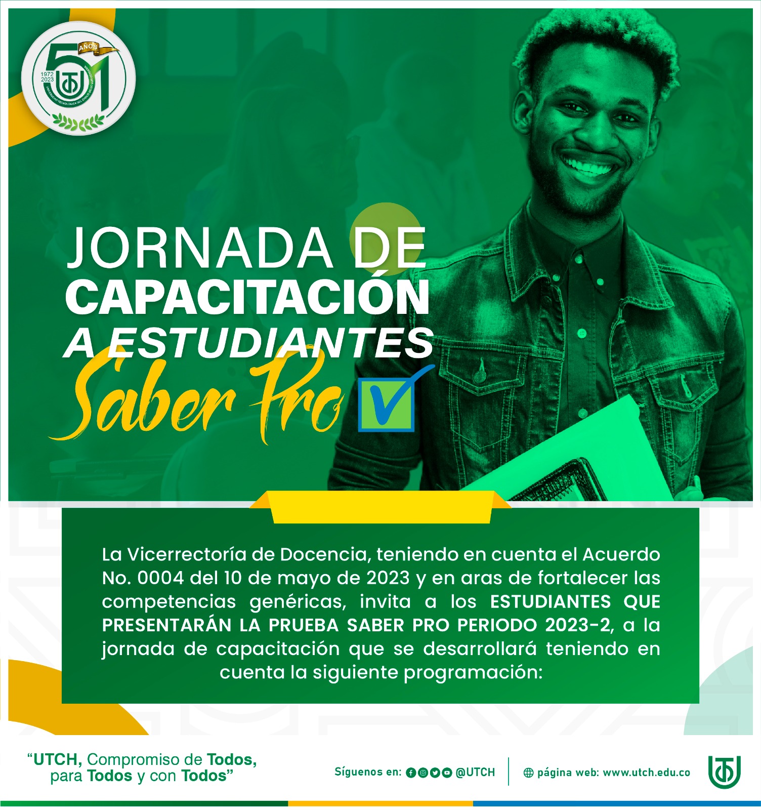 En la UTCH, nos comprometemos a brindar a nuestros estudiantes las mejores oportunidades de crecimiento académico y profesional. Por eso, los invitamos a aprovechar esta jornada de capacitación y simulacro, ya que su participación activa y preparación adecuada en las pruebas SABER PRO contribuirá a mejorar su desempeño individual y, a su vez, elevará el nivel de excelencia de nuestra universidad en estos importantes indicadores.