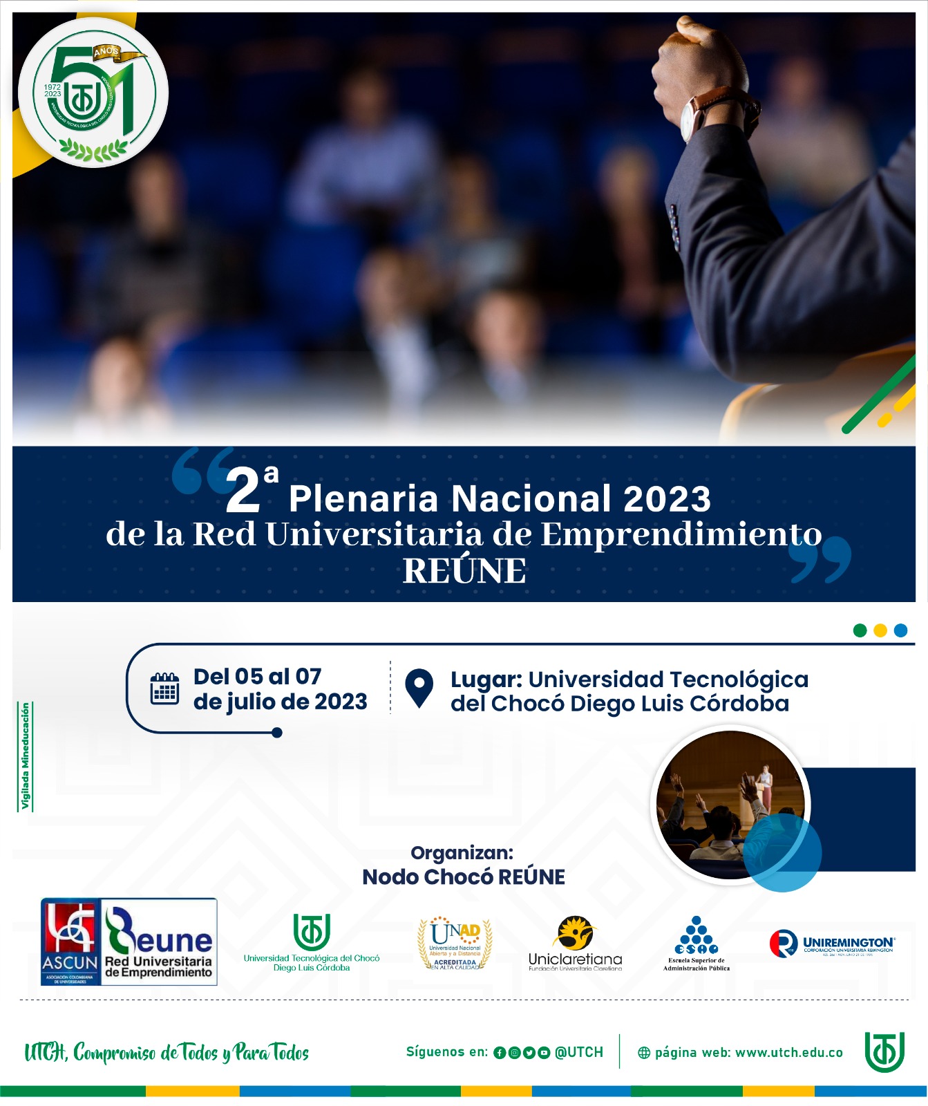La Universidad Tecnológica del Chocó Diego Luis Córdoba, será sede de la Segunda Plenaria Nacional 2023 de la Red Universitaria de Emprendimiento REÚNE, importante encuentro que se llevará a cabo entre los días 5 y 7 de julio de la presente anualidad.