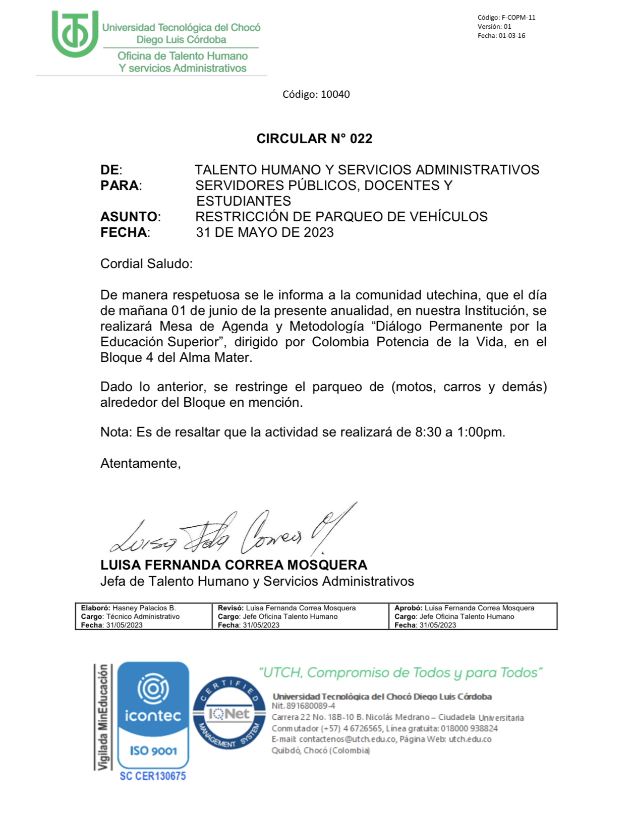 De manera respetuosa se le informa a la comunidad utechina, que el día de mañana 01 de junio de la presente anualidad, en nuestra Institución, se realizará Mesa de Agenda y Metodología “Diálogo Permanente por la Educación Superior”, dirigido por Colombia Potencia de la Vida, en el Bloque 4 del Alma Mater.