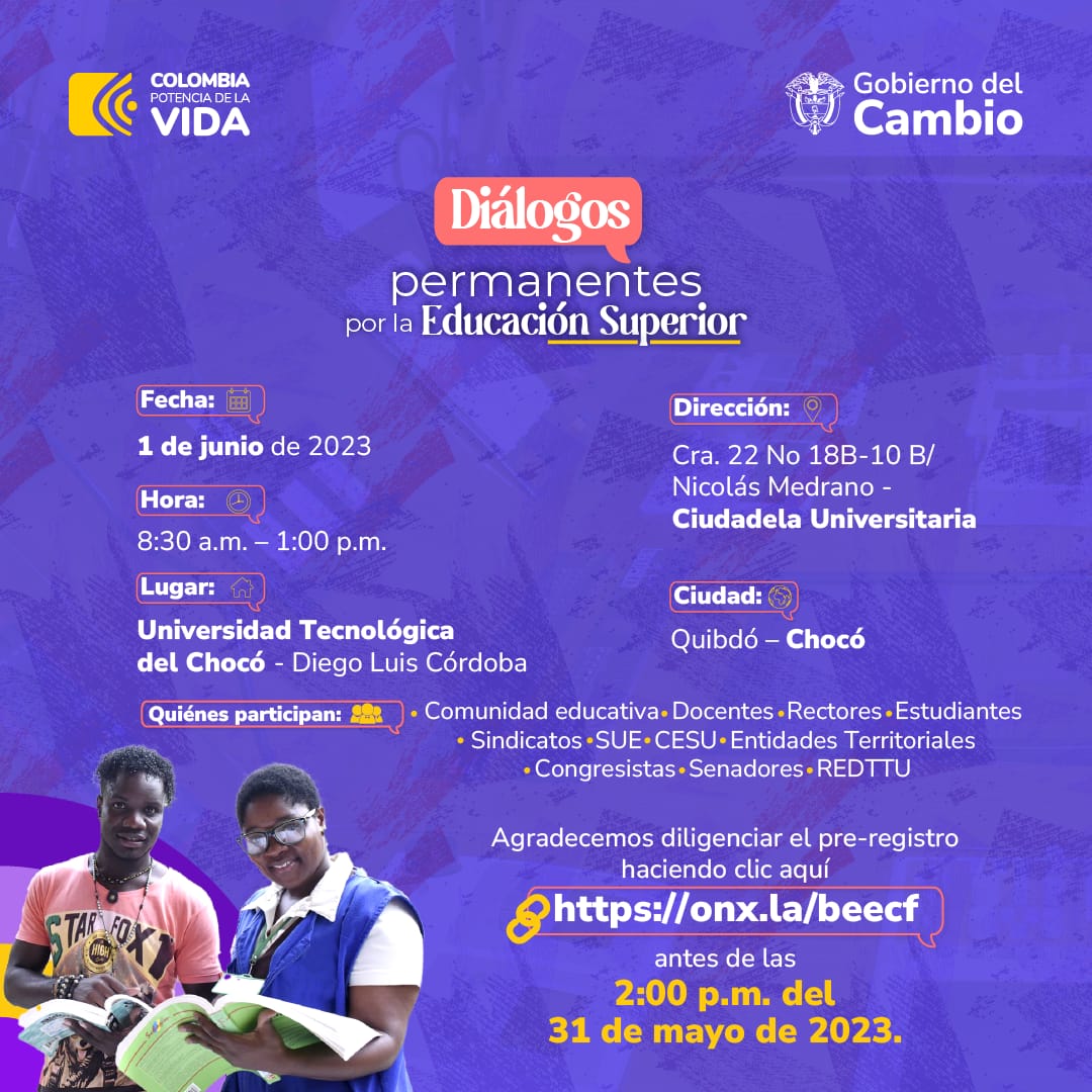 El próximo jueves 1 de junio se realizarán los Diálogos Permanentes por la Educación Superior en Quibdó, en la Universidad Tecnológica del Chocó.
