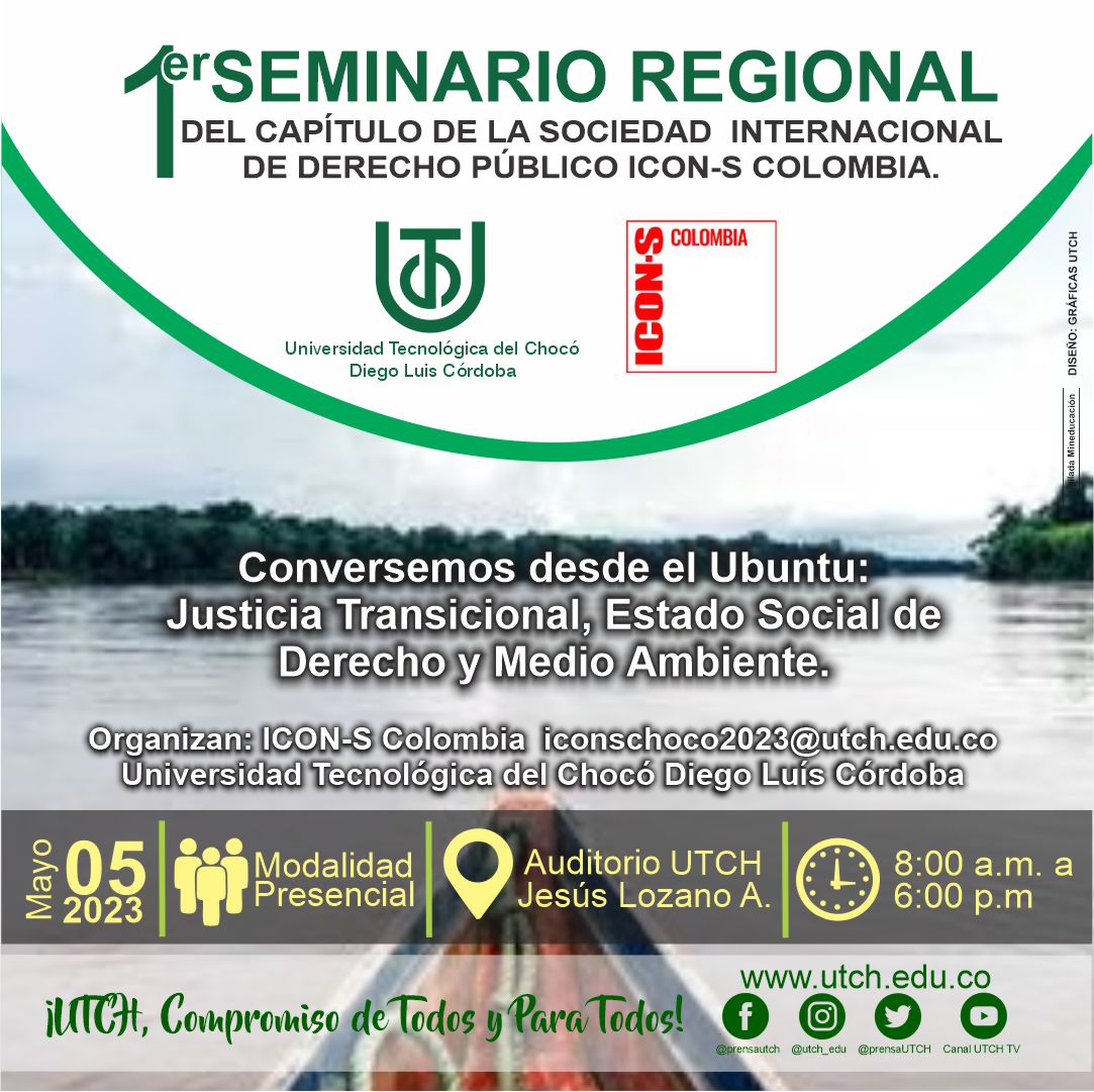 El capítulo Colombia de la Sociedad Internacional de Derecho Público ICON-S, la Facultad de Derecho y Ciencias Políticas de la Universidad Tecnológica del Chocó “Diego Luís Córdoba” y el Comité Asesor del Capítulo Colombia de ICONS, los y las invitan a participar en este espacio de discusión y aprendizaje en clave horizontal donde a través del diálogo de saberes docentes, investigadores, estudiantes, servidores públicos, abogados, líderes, comunitarios y étnicos reflexionan sobre los desafíos de la justicia transicional, el estado social de derecho y la protección del medio ambiente en un territorio reconocido por su riqueza en diversidad biológica, étnica y cultural pero con grandes desafíos para alcanzar la igualdad material.