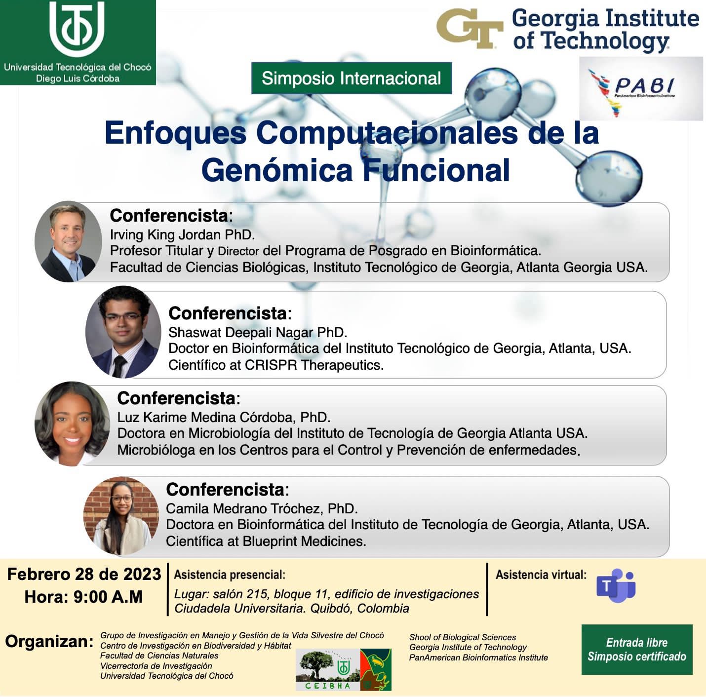La Universidad Tecnológica del Chocó (Colombia) y el Instituto Tecnológico de Georgia (USA), invitan al I SIMPOSIO INTERNACIONAL: Enfoques Computacionales de la Genómica Funcional, que se realizará este 28 de febrero en el salón 215 del bloque 11 de la UTCH y asistencia virtual a través de Teams (link más abajo).